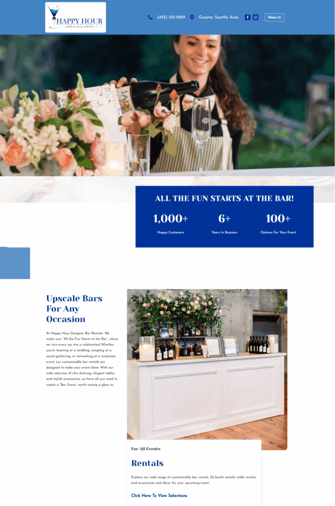 This Makeover Monday, we’re featuring Happy Hour Designer Bar Rentals. Take a look at the updates our team made to their website! Before After Preview Design View More Examples Tags:digital marketinghappy hour designer bar rentalsMakeover Mondaysmall businesswebsitewebsite design Leave a Reply Cancel replyYour email address will not be published. Required fields are marked *Name * Email * Website Comment * Save my name, email, and website in this browser for the next time I comment.